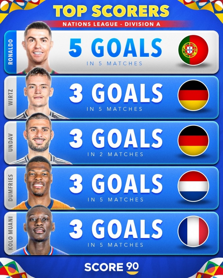 欧国联各级联赛射手榜: