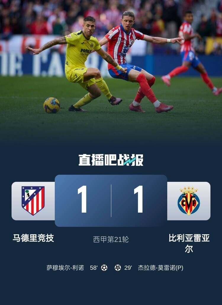 西甲第21轮,马德里竞技1-1战平比利亚雷亚尔,利诺进球。