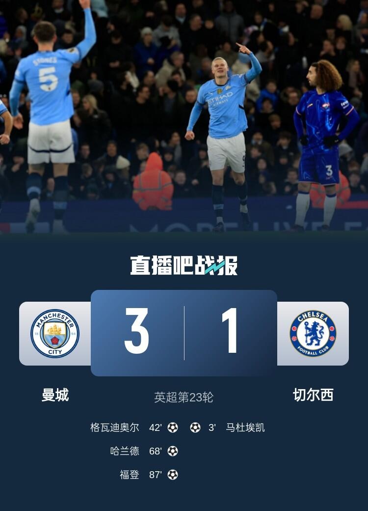 英超第23轮,曼城3-1逆转双杀切尔西,哈兰德传射,胡桑诺夫首秀送礼。