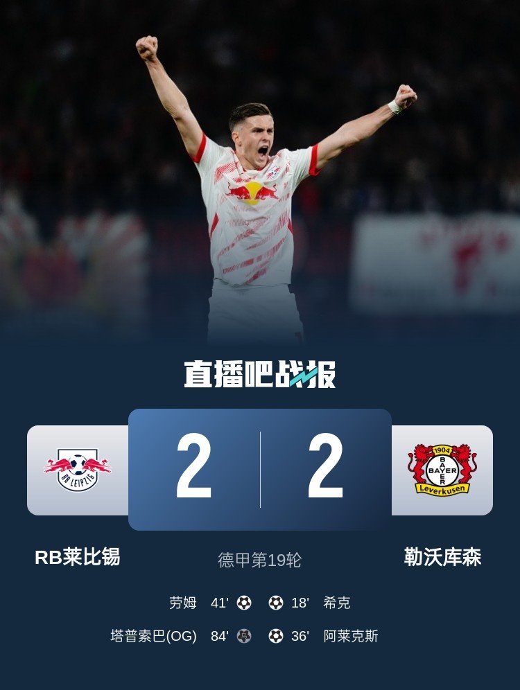 德甲第19轮,勒沃库森2-2RB莱比锡,希克、阿莱克斯进球。
