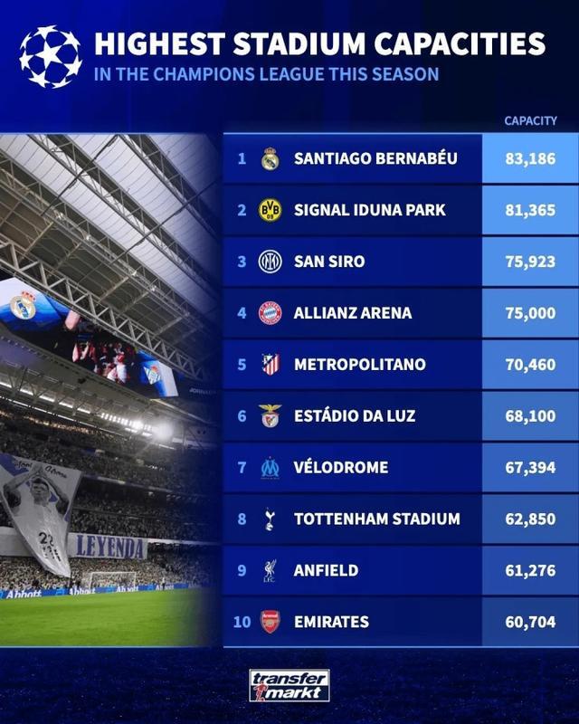 9月18日讯 新赛季欧冠已经重燃战火,欧足联官方盘点了参赛36队10大容量最大球场,伯纳乌83186人居首。
