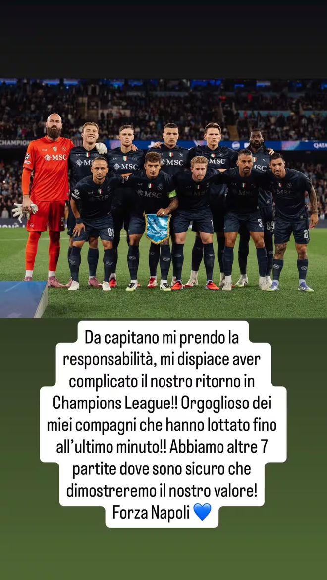 迪洛伦佐写到:作为队长,我该承担责任。很抱歉,我让我们的欧冠之旅变得困难,但我为我的队友们战斗到了最后一刻感到骄傲。我们还有七场比赛,我相信我们会证明自己的价值。那不勒斯加油!