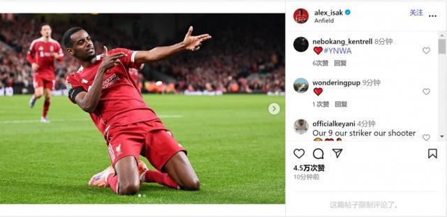 攻入利物浦生涯首球!伊萨克社媒晒比赛照片庆祝