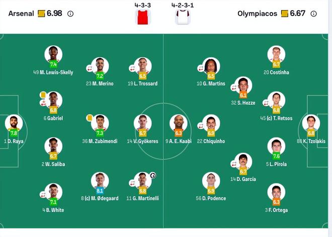 第14分钟,约克雷斯中柱,马丁内利补射破门。之后,拉亚做出世界级的扑救,力保球门不失。下半场加布里埃尔伤退,萨卡补时破门。最终,阿森纳2-0战胜奥林匹亚科斯,欧冠不仅取得2连胜,且一球未失。