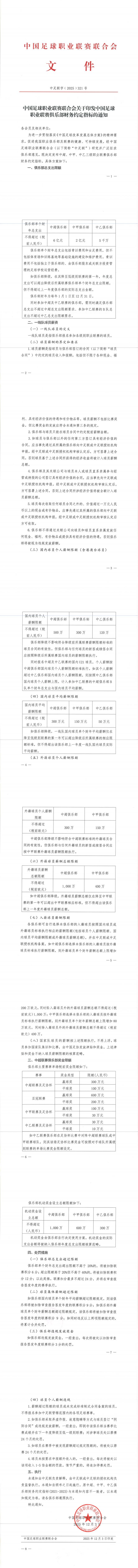 中足联:中超国内球员年薪上限500万元,外援年薪封顶300万欧元
