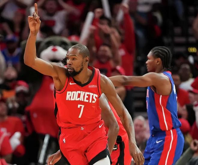火箭队背靠背第二战前往客场挑战东部第1的活塞队,申京怒提1板5失误,谢泼德三分线外7中1,小贾巴里史密斯3中1,火箭队在领先14分的情况下顶住了活塞队的反扑,以111-104险胜对手。火箭三少集体迷失唯唯诺诺,却逼出了最强形态的死神杜兰特!杜兰特苦战40分钟,19投11中(三分球11中5),罚球6中5,狂轰32分+7篮板+3助攻+1抢断+1盖帽的全面数据,失误数为0,场上正负值高达+18。